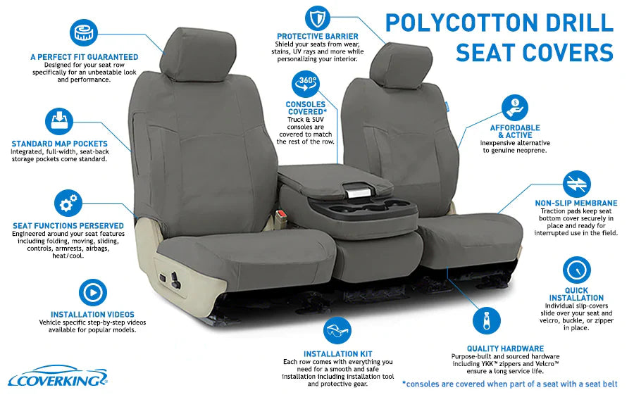 Introducing Coverking's premium Polycotton Drill Custom Seat Covers — the perfect solution for enhancing and protecting your vehicle's interior with a blend of comfort and durability.