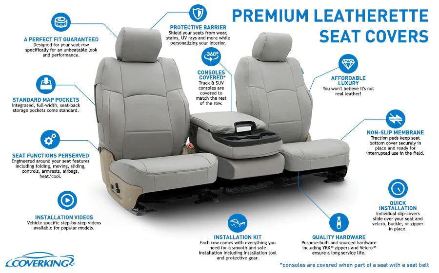 Introducing Coverking's Premium Leatherette Custom Seat Covers — the epitome of luxury and protection for your vehicle's interior. Crafted from highquality, synthetic leather material, these customfit seat covers emulate the look and feel of genuine leather without the hefty price tag or maintenance hassles. Designed for daily comfort and elegance, they provide exceptional protection against spills, stains, and wear, instantly elevating the aesthetic appeal of your car, truck, or SUV.